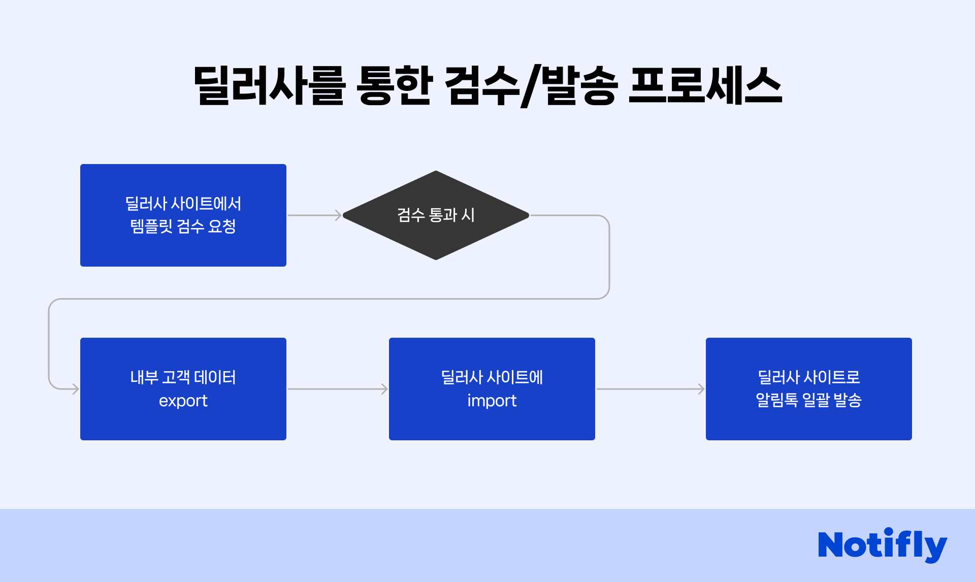 딜러사를 통해 템플릿 검수를 한 후, 딜러사에 바로 고객수신 정보 리스트를 넣고, 수동으로 발송할 수 있습니다. 하지만 가장 번거롭고 반복적인 리소스가 많이 발생하며, 매번 수동 발송 해야하기에 추천하지 않습니다.