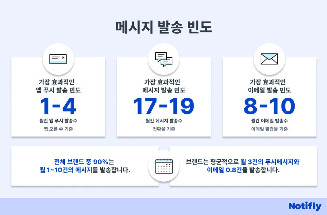 Braze에서 조사한 결과에 따르면 이메일/메시지/앱 푸시 알림 등 채널별 주요 성과에 최적화된 메시지 발송 빈도는 다음과 같습니다.