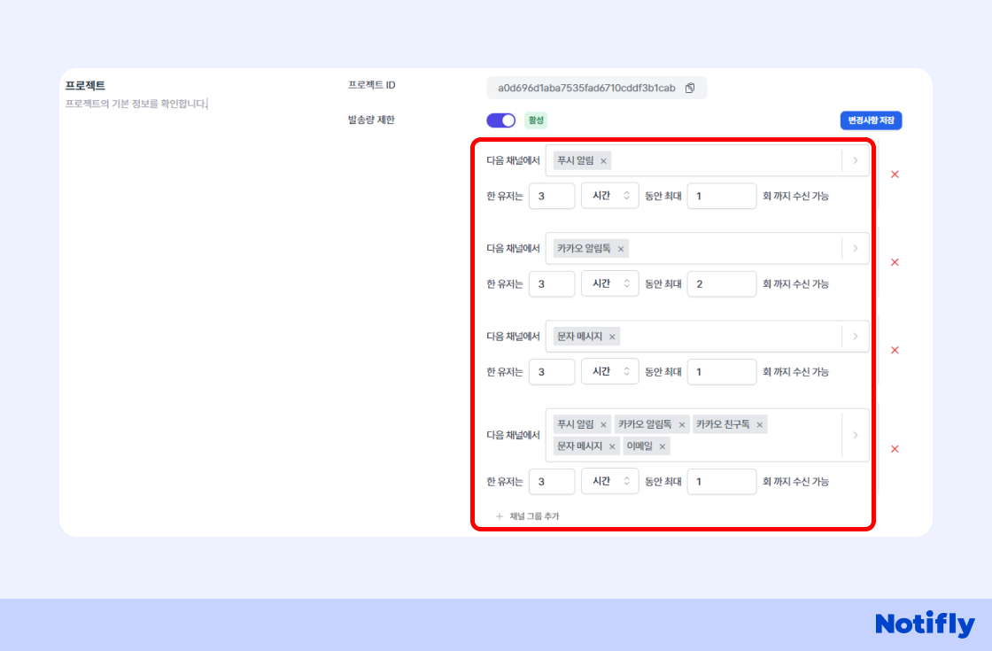 노티플라이 [설정] - [프로덕트 및 프로젝트] 에서 발송량 제한 기능을 사용하면 메시지 채널별로 특정 기간 최대 수신 가능 수량을 제한할 수 있습니다. 고객의 유저 여정을 고려하여 채널별 메시지 발송 수량을 제한하는 등 고객 피로도 관리에 효과적입니다.