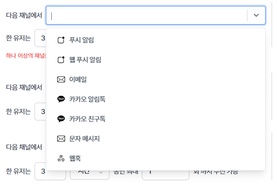 여러 발송 채널을 한번에 제한하고 싶을 경우, 다중 채널 선택이 가능합니다.